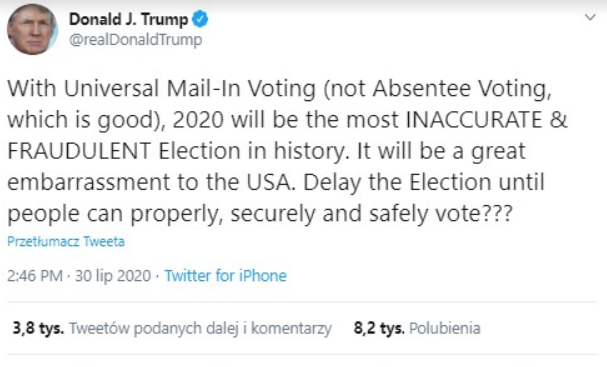 Donald Trump zaczyna odczuwać możliwą przegraną w zbliżających się wyborach w Stanach Zjednoczonych. W swoim ostatnim tweecie sugeruje, że przy obecnym stanie pandemii głosowanie może nie być najlepszym pomysłem. Co jednak w przypadku, jeśli faktycznie miałoby dojść do przesunięcia tych wyborów?