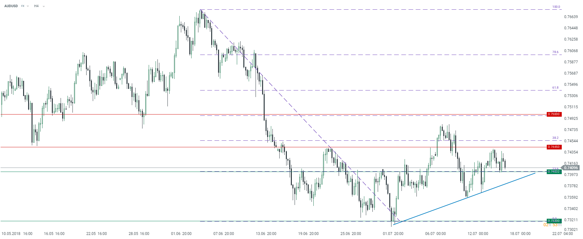 Spoglądając na wykres 4-godzinowy pary AUDUSD możemy zauważyć, że para stara się utrzymywać powyżej wsparcia na poziomie 0,7400 (ten poziom pokrywa się z poziomem 23,6% zniesienia Fibo). Niewiele niżej przebiega linia trendu wzrostowego, gdzie po dotarciu do niej byki mogą ponownie stać się bardziej aktywne. Najważniejszym poziomem oporu wydają się okolice 0,7445, a następnie okrągły poziom 0,7500. Źródło: xStation5.