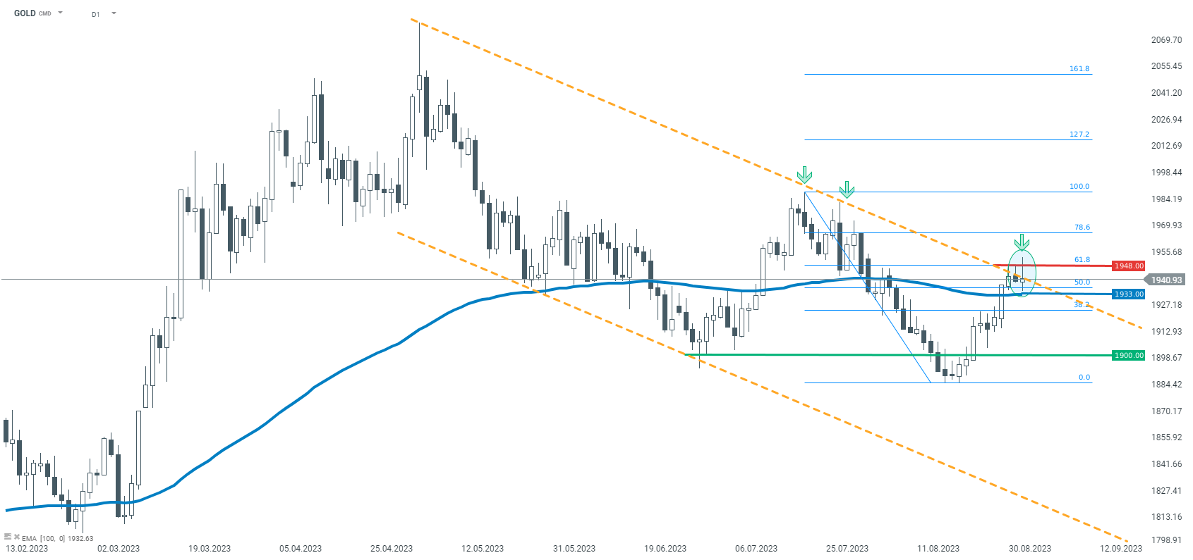 Dolar amerykański zareagował pozytywnie na dzisiejsze dane z USA. Notowania głównej pary walutowej spadły dziś poniżej poziomu 1,08 USD, co może prowadzić do kontynuacji spadków po weekendzie.Jeśli negatywny sentyment się utrzyma, nie będzie to dobra wiadomość dla rynku złota. Patrząc tehcznieni na interwał D1, cena zmaga się aktualnie z górnym ograniczeniem szerokiego kanału spadkowego, które zbiega się z mierzeniem 61,8% Fibonacciego ostatniej fali spadkowej. W przypadku pojawienia się tutaj sygnału podażowego, niewykluczony jest powrót do trendu i ponowny test okolic 1900$. Z drugiej strony, w przypadku wybicia w górę, wzrosty na rynku złota mogą przybrać na sile. Wtedy też najbliższym targetem dla kupujących stanie się mierzenie 78,6% Fibo.