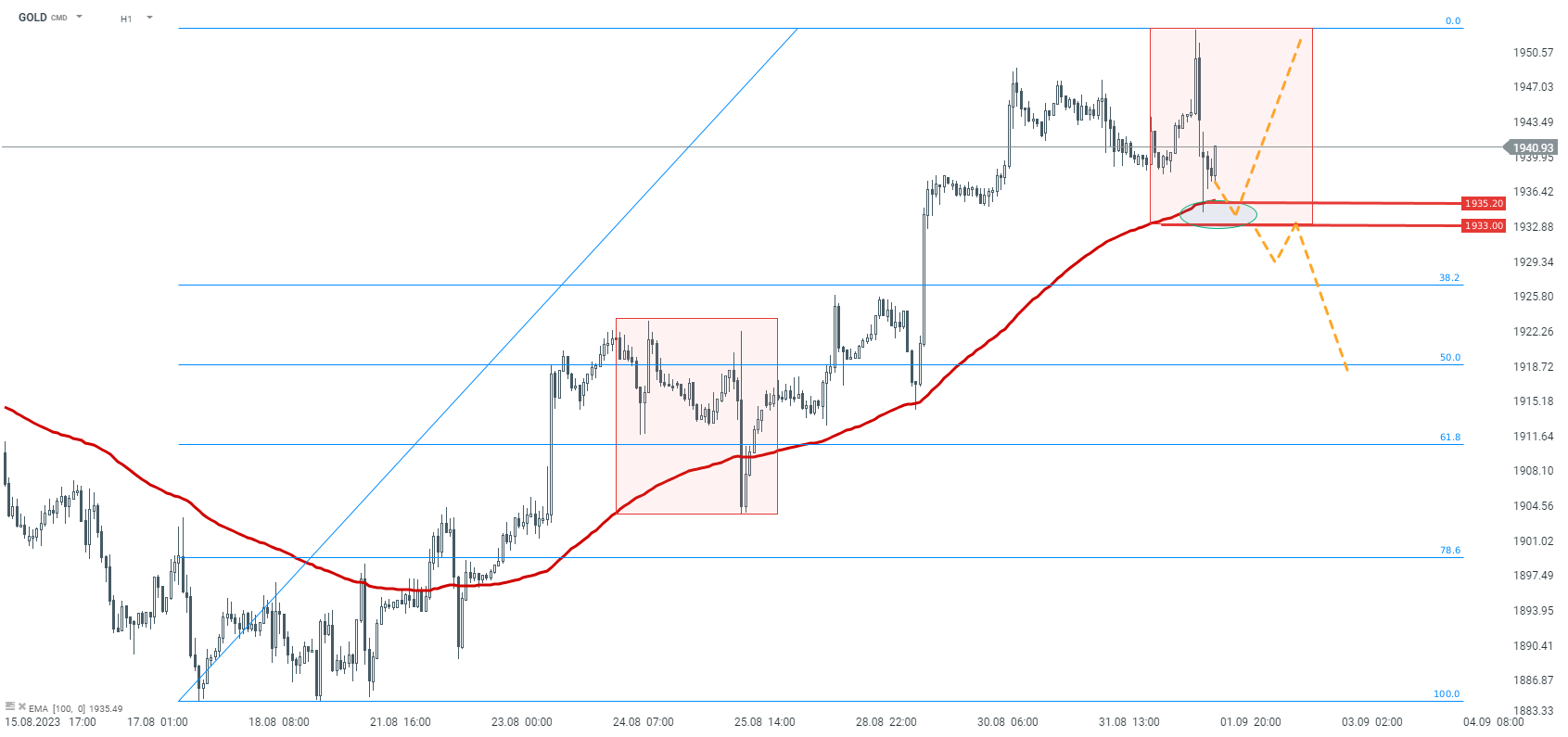 Jesli chodzi z kolei o niższy interwał czasowy - H1, obserwujemy reakcję na wysokości strefy wsparcia 1933 - 1935$ - pokrywa się ona ze średnią EMA100 z interwału D1. Dopóki cena utrzymuje się powyżej, istnieje szansa na wznowienie ruchu w górę. Niemniej w momencie załamania się poniżej, przecena powinna przybrać na sile.