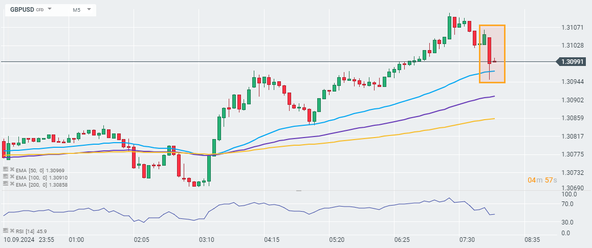 Dane makro wskazują na słabnącą gospodarkę brytyjską, co zwiększa szanse na dalsze obniżki stóp procentowych przez Bank Anglii. Wszystkie odczyty pokazały wyraźnie gorsze dane od oczekiwań. Wgłębiając się w dane PKB, sektor usługowy przyczynił się do wzrostu w lipcu na poziomie 0,11% patrząc na PKB, ale zostało to zneutralizowane przez spadek w sektorze przemysłowym o 0,1% oraz spadek w sektorze konstrukcyjnym o 0,03%. W reakcji na dane funt brytyjski nieznacznie stracił na wartości.