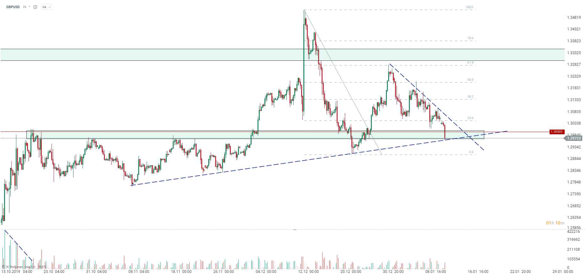 Funt jak widać interpretuje całą paczkę dzisiejszych danych bardzo negatywnie. Para cofa się wyraźnie poniżej poziomu 1,3000 i testuje ważną strefę wsparcia wynikającą z lokalnych szczytów z przełomu października oraz listopada. Widać wobec tego, że cała "euforia" Brexitowa została już zneutralizowana. Co równie ważne, testowana jest linia trendu wzrostowego po dołkach z listopada oraz grudnia. Oczywiście grudniowy dołek jest równocześnie najbliższym silniejszym wsparciem, a następnie okolice poziomu 1,2800. Źródło: xStation5