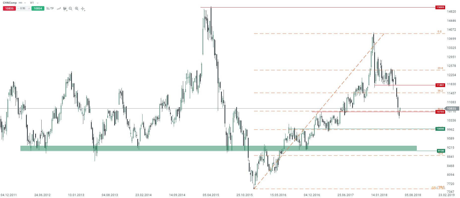 Chińska giełda odbija na początku nowego tygodnia. Ostatni tydzień zamknął się jednak poniżej krytycznego poziomu technicznego. Kolejne bardziej znaczące wsparcie można znaleźć w okolicy 9100 punktów. Źródło: xStation5