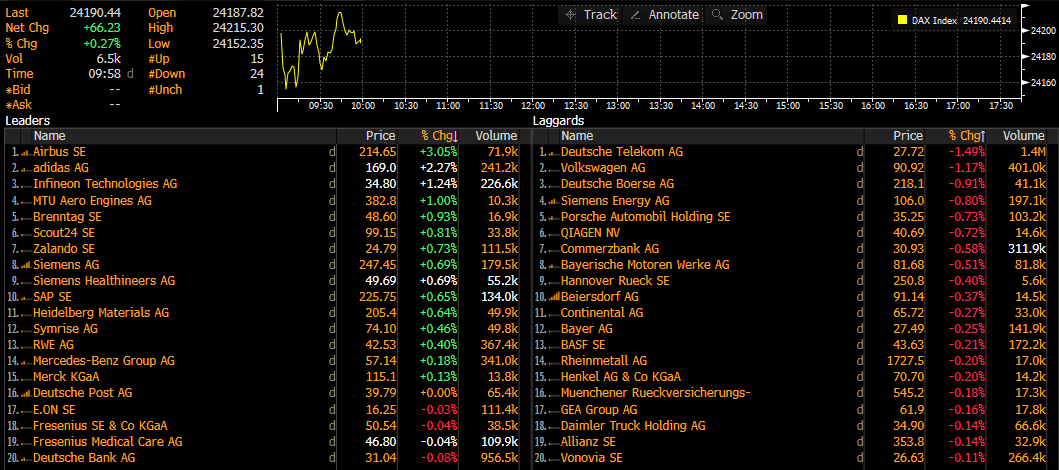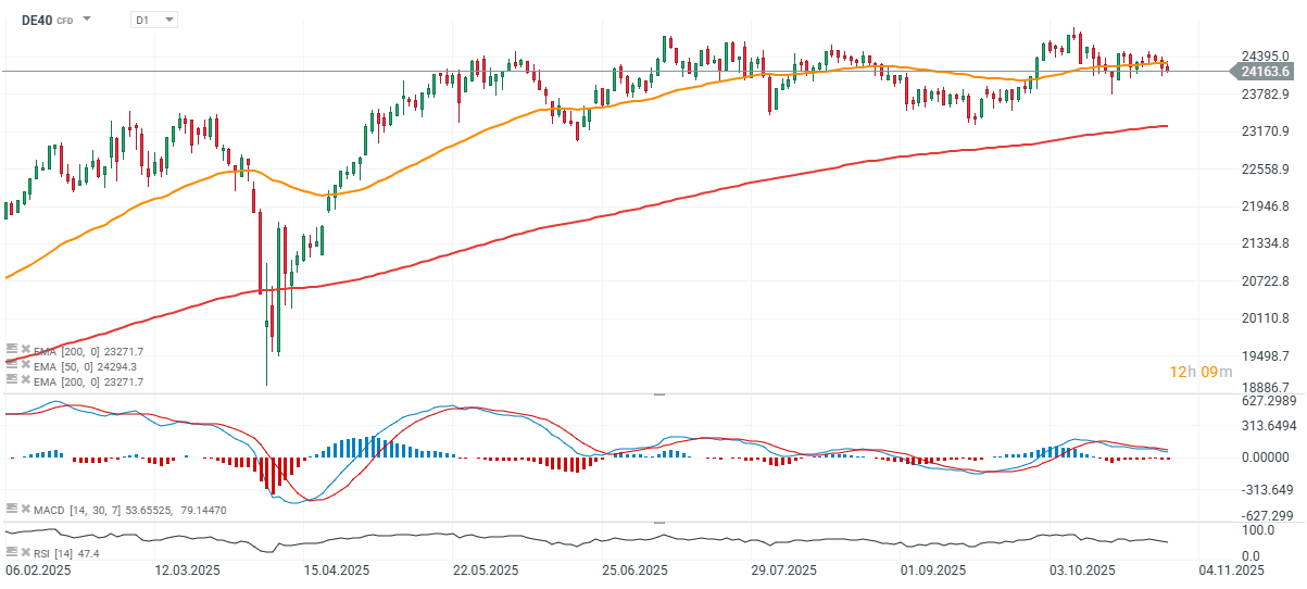 Rynki w Europie czekają na decyzję Europejskiego Banku Centralnego o godzinie 14:15 i przemówienie przewodniczącej banku, Christine Lagarde, o godzinie 14:45. Consensus rynkowy zakłada utrzymanie stóp w strefie euro bez zmian. Inwestorzy w Niemczech oczekują także danych o krajowej inflacji, które poznamy o 14:00; oczekiwany jest spadek do 2.2% r/r wobec 2.4% poprzednio. Miesięcznie inflacja w Niemczech wzrosnąć ma o 0,2%, bez zmian względem poprzedniego odczytu. Kontrakty na DAX cofają się dziś poniżej 24200 punktów.