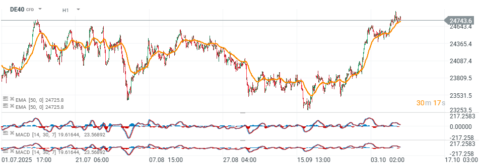 Kontrakt na niemiecki DAX (DE4) oscyluje przy 24750 punktów i testuje okolice EMA50 (pomarańczowa linia) na interwale godzinowym, wsparte dodatkowo poprzednimi reakcjami cenowymi, z początku lipca.