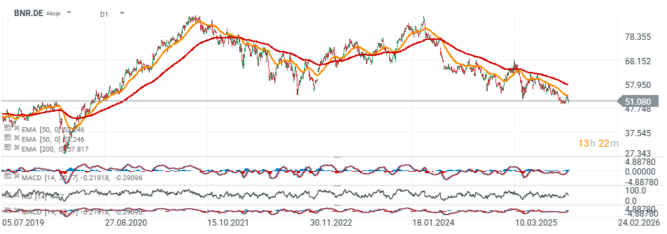 Akcje Brenntag od dłuższego czasu spadają i oscylują w pobliżu poziomów widzianych ostatni raz w sierpniu 2020 roku. Mimo to, wycena spółki chemicznej, mierzona wskaźnikiem c/z jest wciąż sięga wysokich, dwucyfrowych poziomów.