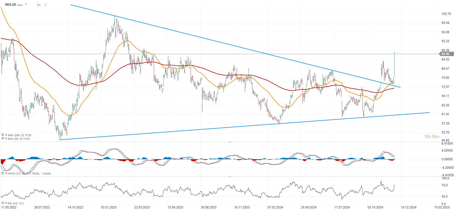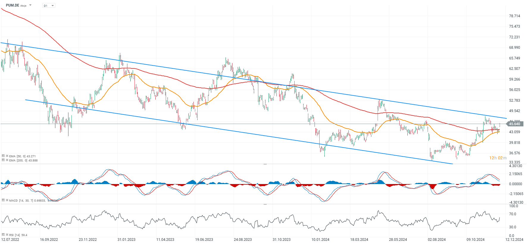 Analitycy Oddo BHF podnieśli rekomendację dla akcji Puma (PUM.DE) do 60 EUR za walor. Akcje producenta odzieży i obuwia sportowego rosną dziś o prawie 5% i wybijają się powyżej EMA200 (czerwona linia), potencjalnie odwracając trend spadkowy.