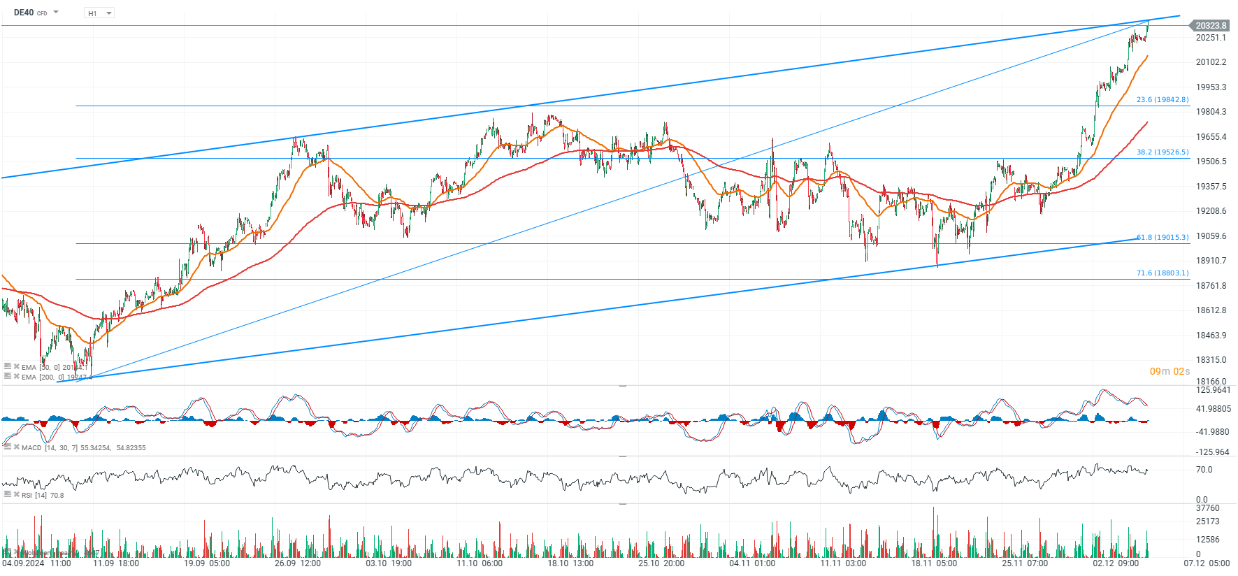 ntrakty terminowe na DAX (DE40) przedłużają wczorajszą, wzrostową sesję i 'lądują' na nowych szczytach. Sentymenty na europejskim rynku akcji są dziś bardzo solidne, po wczorajszej, świetnej sesji w USA, gdzie ponad 1.2% zyskiwał Nasdaq 100. Rheinmetall (RHM.DE) zyskuje kolejne 1% i notowany jest na ATH przy 660 EUR za walor
