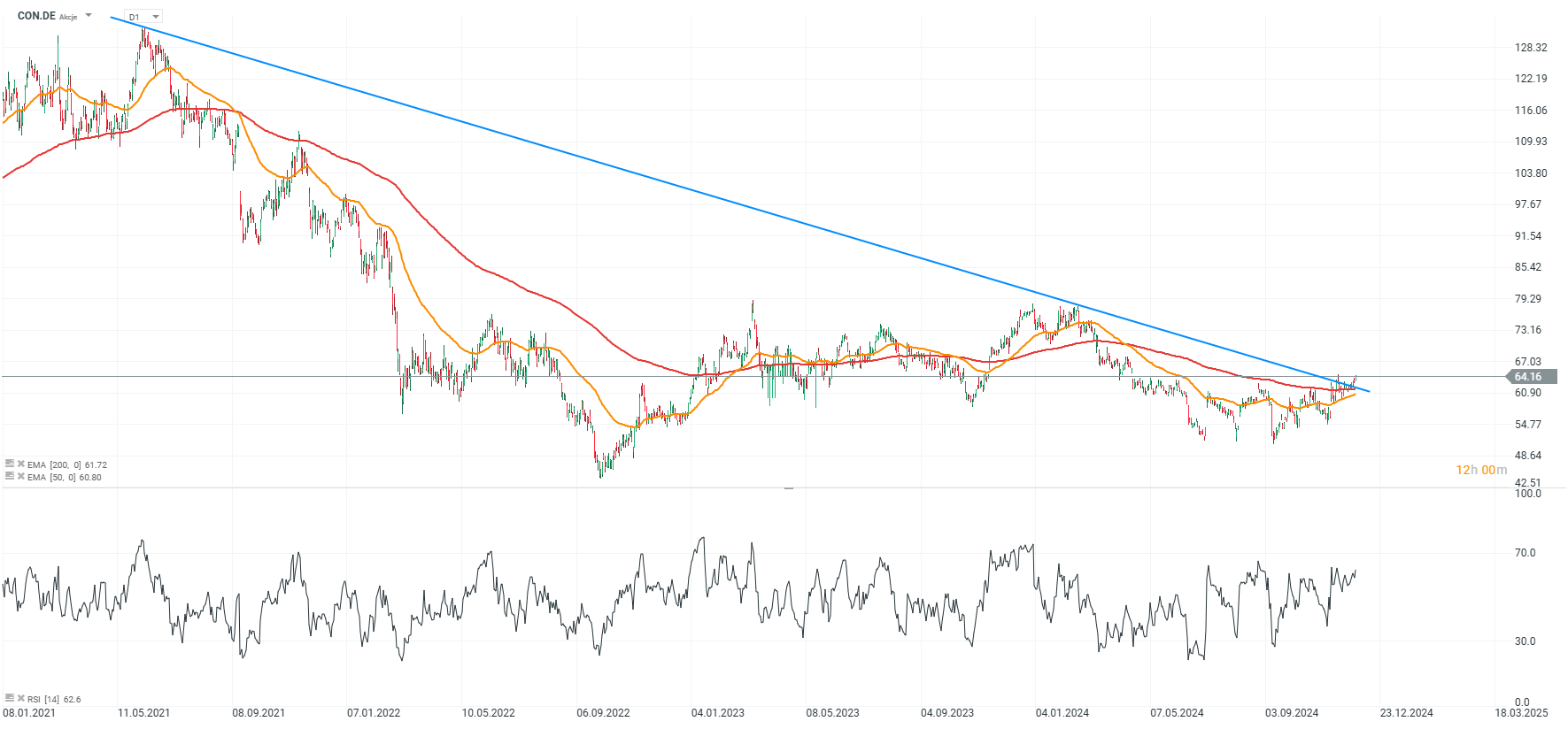 Walory spółki Continental zyskują dziś prawie 2% i kontynuują wzrost powyżej linii spadkowego trendu, oraz średniej EMA200 (czerwona linia).