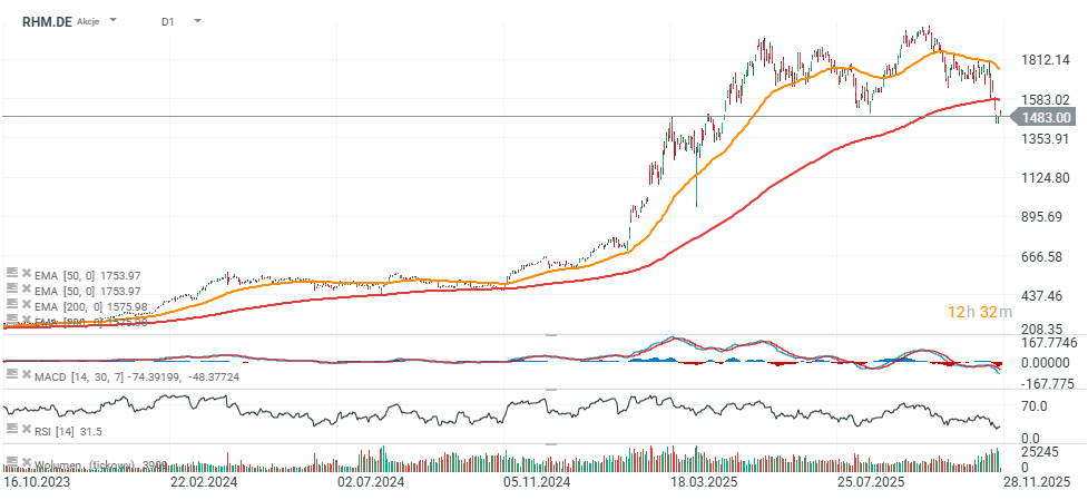 Kurs Rheinmetall spadł poniżej EMA200 pierwszy raz od 3 ostatnich lat, sugerując, że perspektywy pokoju w Ukrainie są realne. Mimo optymistycznych prognoz i wyników, wycena spółki może istotnie ucierpieć w 'pokojowym wariancie' gdy momentum przeniesie się ze spółek obronnych w inne obszary gospodarki.
