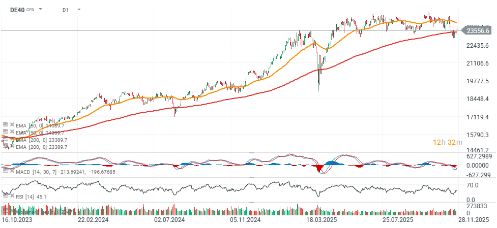 Nastroje niemieckiego rynku akcji nie są dziś optymistyczne; kontrakt DE40 spada o blisko 0,3% wobec spadków akcji z sektora motoryzacyjnego oraz korekty w walorach BASF. Po serii spadków stabilizować próbuje się kurs niemieckiego koncenru militarnego Rheinmetall (RHM.DE), który w ostatnim czasie spadł o prawie 25% od historycznych szczytów w okolicach 2000 EUR za walor.