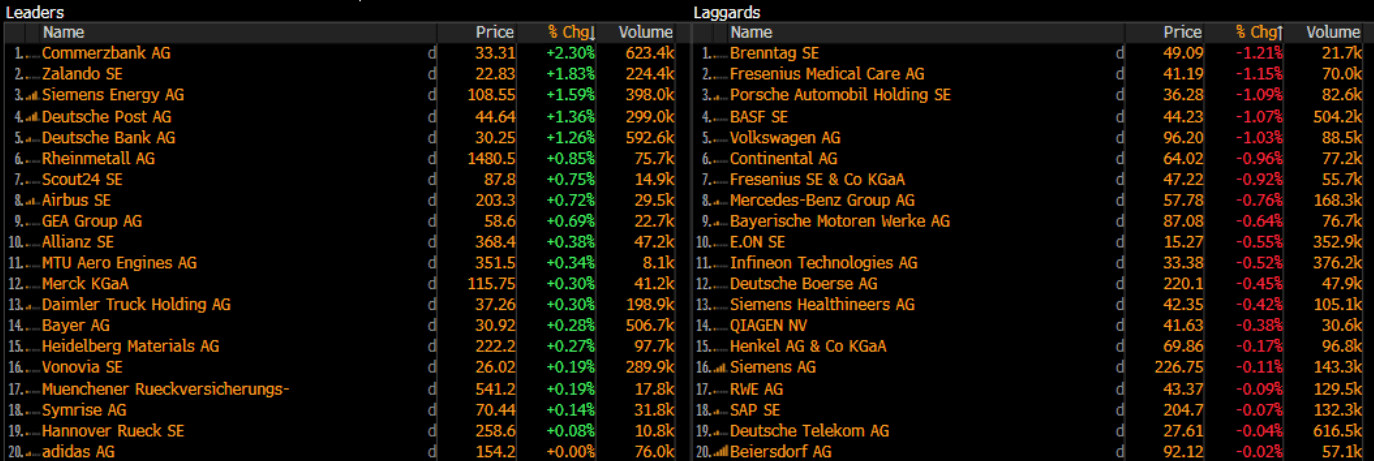 Wzrosty dominują Zalando, Commerzbank, Siemens Energy i Deutsche Bank. Słabo radzą sobie walory Brenttag, Fresenius, Porsche, BASF i Volkswagena.