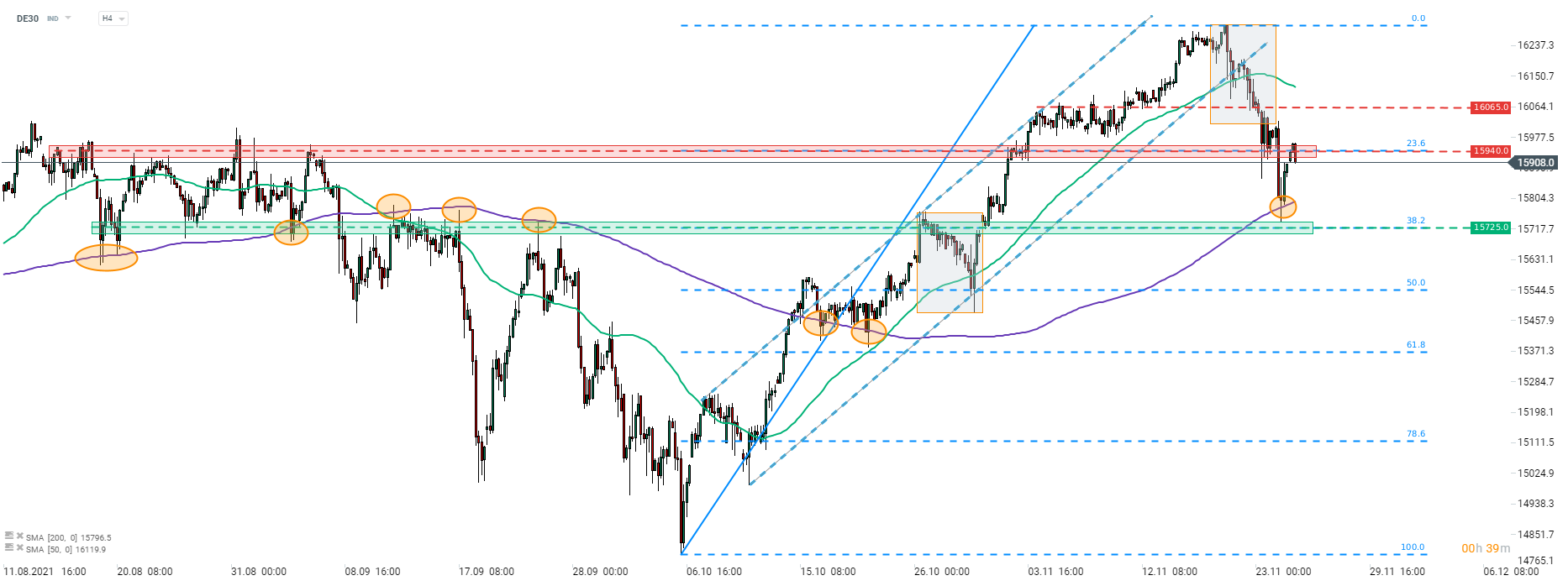 DE30 przełamał wczoraj poziom poniżej zniesienia 23,6% Fibo, ostatniego impulsu wzrostowego (rejon 15 940 pkt). Ruch spadkowy pogłębił się i osiągnął poziom zniesienia 38,2% na 15 725 pkt. Niedźwiedzie nie były jednak w stanie zepchnąć indeksu poniżej tej przeszkody i rozpoczęło się odreagowanie. DE30 zdołał wspiąć się z powrotem do strefy 15 940 pkt, ale nie udało się przebić ponad nią. W chwili obecnej można zaobserwować cofnięcie z tego obszaru i nie można wykluczyć, że pojawi się kolejny ruch w dół. Wspomniane wcześniej zniesienie 38,2% jest kluczowym wsparciem, które należy obserwować. 200-okresowa średnia krocząca na interwale H4 (fioletowa linia) również powinna być uważnie obserwowana, ponieważ przełamania powyżej lub poniżej nie trwają długo i są szybko korygowane (pomarańczowe okręgi).