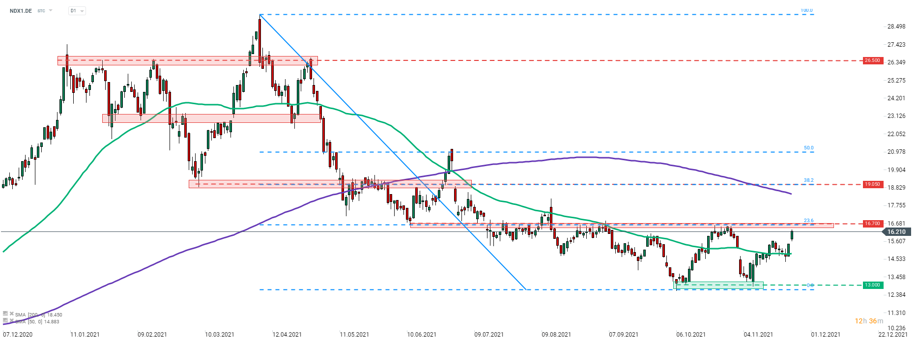 Nordex (NDX1.DE) drożeje dziś o ponad 4%. Akcje są wspierane przez zieloną kampanię nowej koalicji. Obecnie cena akcji zbliża się do oporu na poziomie 16,70 euro. Strefa ta, wyznaczona przez zniesienie 23,6% Fibo, ograniczała ruchy wzrostowe w ostatnich miesiącach. W przypadku przebicia powyżej, uwaga byków przesunie się w kierunku zniesienia 38,2%, przy poziomie 19,05 euro za akcję. Źródło: xStation 5