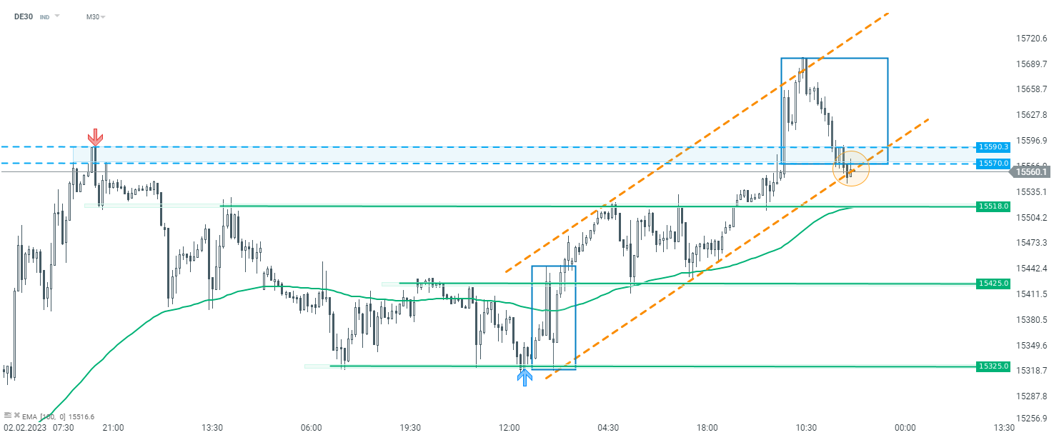 Patrząc technicznie na interwał M30, korekta dotarła do kluczowej strefy wsparcia, która została oznaczona na niebiesko. Obszar ten wynika z położenia dolnego ograniczenia układu 1:1, a także wcześniejszych reakcji cenowych, jak i dolnego ograniczenia kanału wzrostowego. W przypadku pojawienia się tutaj sygnałów popytowych, niewykluczone będzie wznowienie trendu wzrostowego. W przeciwnym razie, złamanie poziomu wsparcia może doprowadzić do wygenerowania większej korekty, bądź nawet zmiany sentymentu. Wtedy też jako kolejne wsparcie należy traktować poziomy: 15518, 15425 i 15325 pkt.