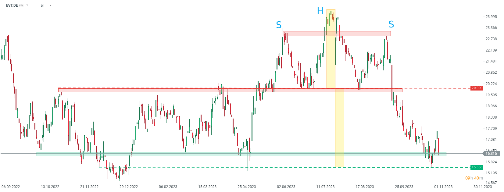 Evotec (EVT.DE) spada dziś o 7% po obniżeniu rekomendacji przez RBC. Cena akcji próbuje przebić strefę wsparcia 16,30 euro i powrócić do ostatnich minimów w rejonie 15,55 euro. Źródło: xStation5