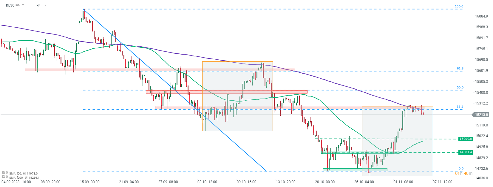 - DE30 cofa się z ważnej strefy oporu