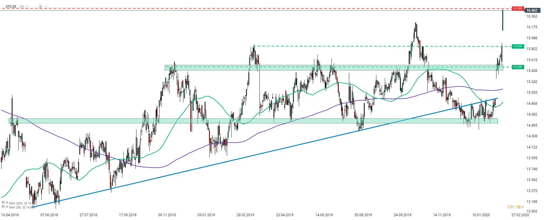 Deutsche Telekom (DTE.DE) wysterzlił w górę po publikacji danych za 2019 rok. Aktualnie notowania znajdują się na najwyższym poziomie od połowy 2017 roku. Jako krótkoterminowy opór należy traktować poziom 16,5€, gdzie znajduje się górne ograniczenie akresu handlu z okresu styczeń - kwiecień 2017. Źródło: xStation