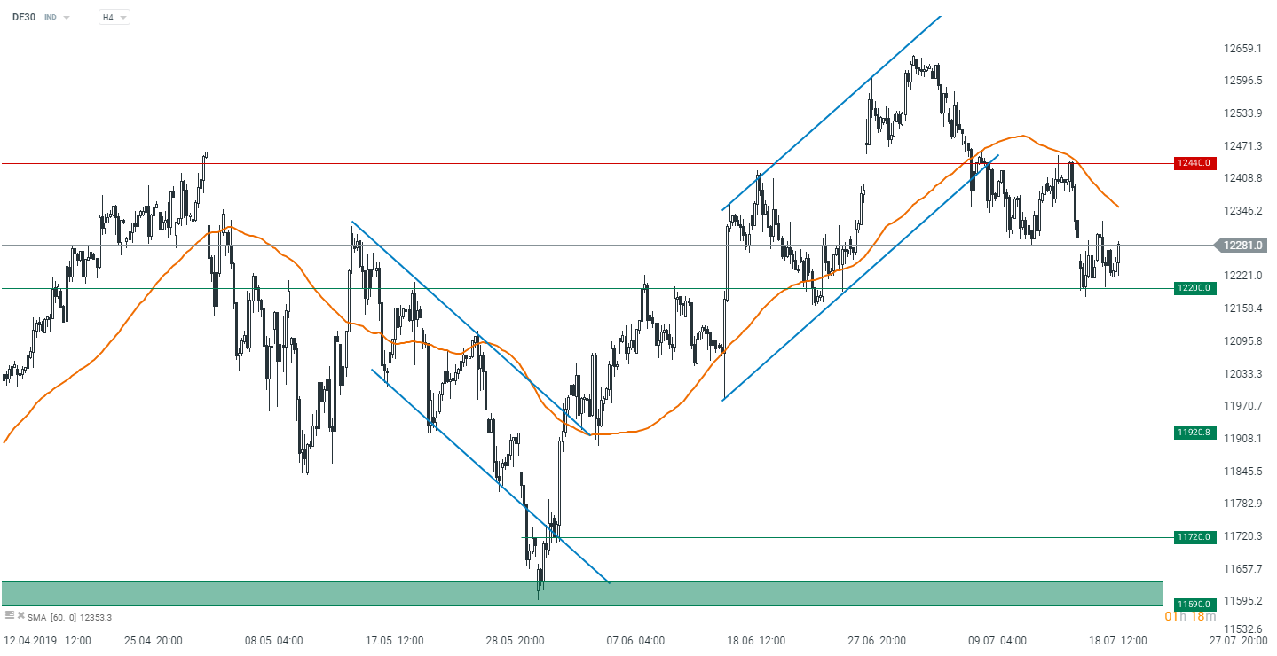 Patrząc na dzienny interwał czasowy na indeksie DAX w Niemczech, można dojść do wniosku, że byki są w odpowiedniej pozycji, aby spróbować ruchu w górę, ponieważ w zeszłym tygodniu kurs zdołał utrzymać się powyżej 12 200 punktów. Posiedzenie EBC stanowi jednak główne zagrożenie dla tego scenariusza, biorąc pod uwagę, że oczekiwania dotyczące złagodzenia polityki pieniężnej wydają się wysokie. Z czysto technicznego punktu widzenia można zauważyć, że byki musiałyby uporać się z 60-okresową średnią kroczącą, gdyby chciały wrócić w okolice poziomu 12 440 punktów. Może to okazać się dla nich twardym orzechem do zgryzienia, aczkolwiek EBC może dostarczyć silny impuls. Źródło: xStation5.