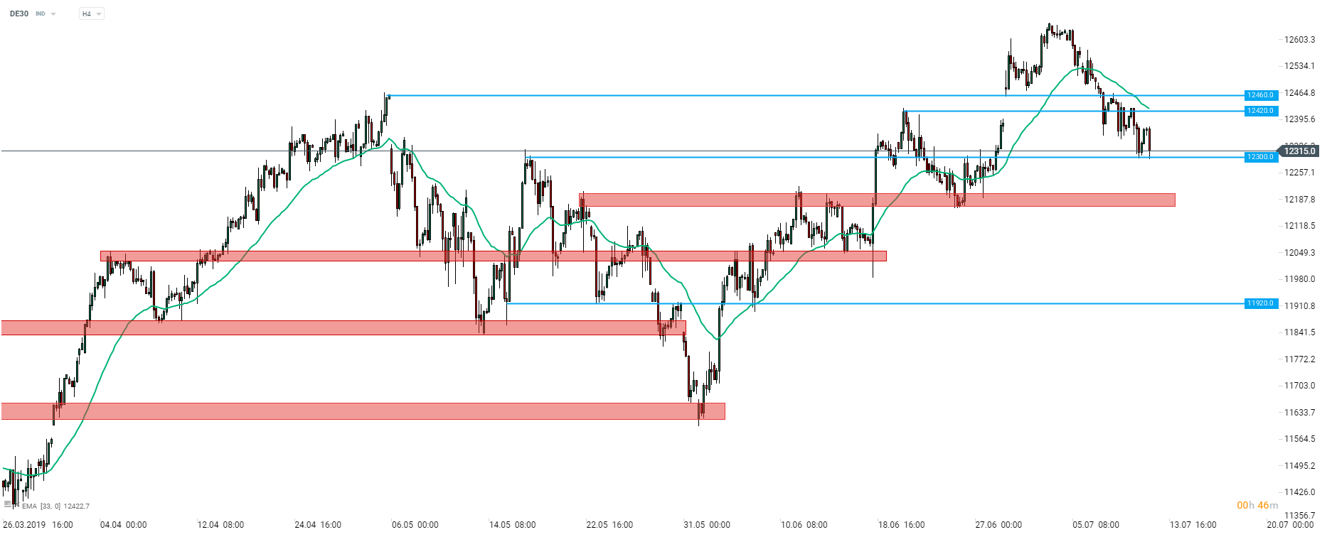 Cofnięcie się na rynku DE30 jest kontynuowane. Niemiecki indeks przełamał się poniżej poziomu 12400 pkt i w momencie pisania analizy testuje okolice 12300 pkt. Bykom udało się wczoraj obronić ten poziom, ale czy będą w stanie to zrobić również dzisiaj? Wyłamanie poniżej otworzyłoby drogę do strefy wsparcia w okolicach ostatniego lokalnego dołka (12170 pkt). Źródło: xStation5