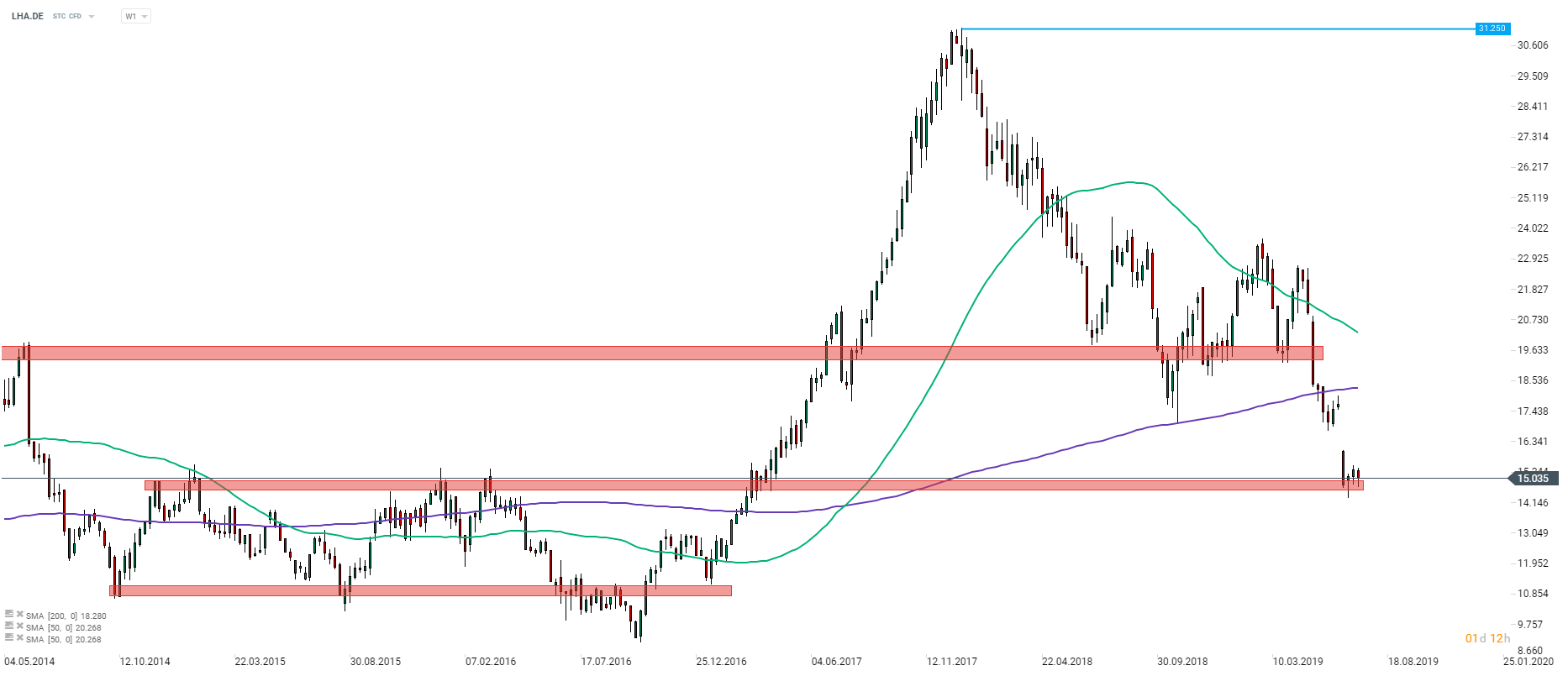 Akcje Lufthansy (LHA.DE) nie odzyskały kondycji po znacznym spadku w połowie czerwca. Cena akcji walczy o odbicie od długoterminowej strefy wsparcia cenowego w okolicach 14,65-14,90 euro. Potencjalny strajk personelu powinien być głównym krótkoterminowym katalizatorem zmian cen akcji. Źródło: xStation5.