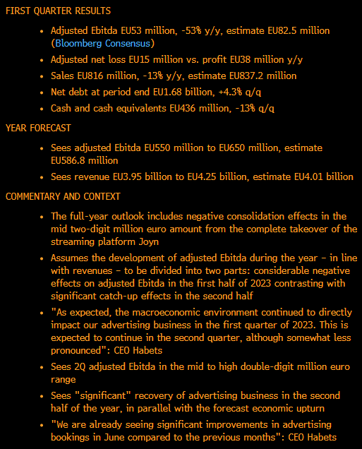 Walory spółki ProSieben (PSM.DE) tracą dzisiaj blisko 1% w związku z publikacją słabszych od oczekiwań wyników kwartalnych. Skorygowana EBITDA wypadła na poziomie 53 mln euro, czyli o 53% mniej w ujęciu r/r. Prognoza analityków zakładała, że skorygowana EBITDA wyniesie 82,5 mln euro. Skorygowana strata netto wyniosła 15 mln euro wobec zysku netto na poziomie 38 mln euro odnotowanego rok temu. Spółka potwierdziła swoje prognozy całoroczne, co nieco zredukowało skalę wyprzedaży.
