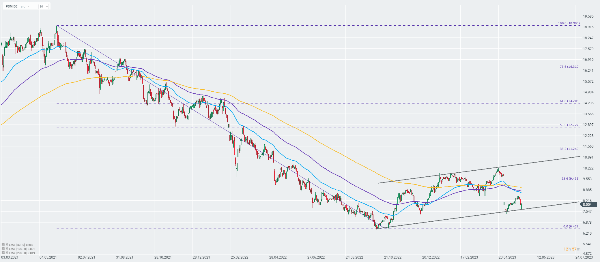 Wykres akcji spółki ProSieben (PSM.DE), interwał D1. W chwili obecnej walory spółki testują dolne ograniczenie kanału wzrostowego zaznaczonego na wykresie. Źródło: xStation 5
