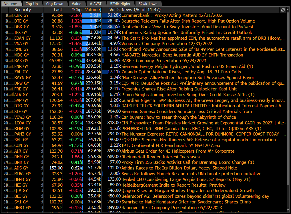 Największe zmiany procentowe oraz informacje z poszczególnych spółek z indeksu DAX. Źródło: Bloomberg