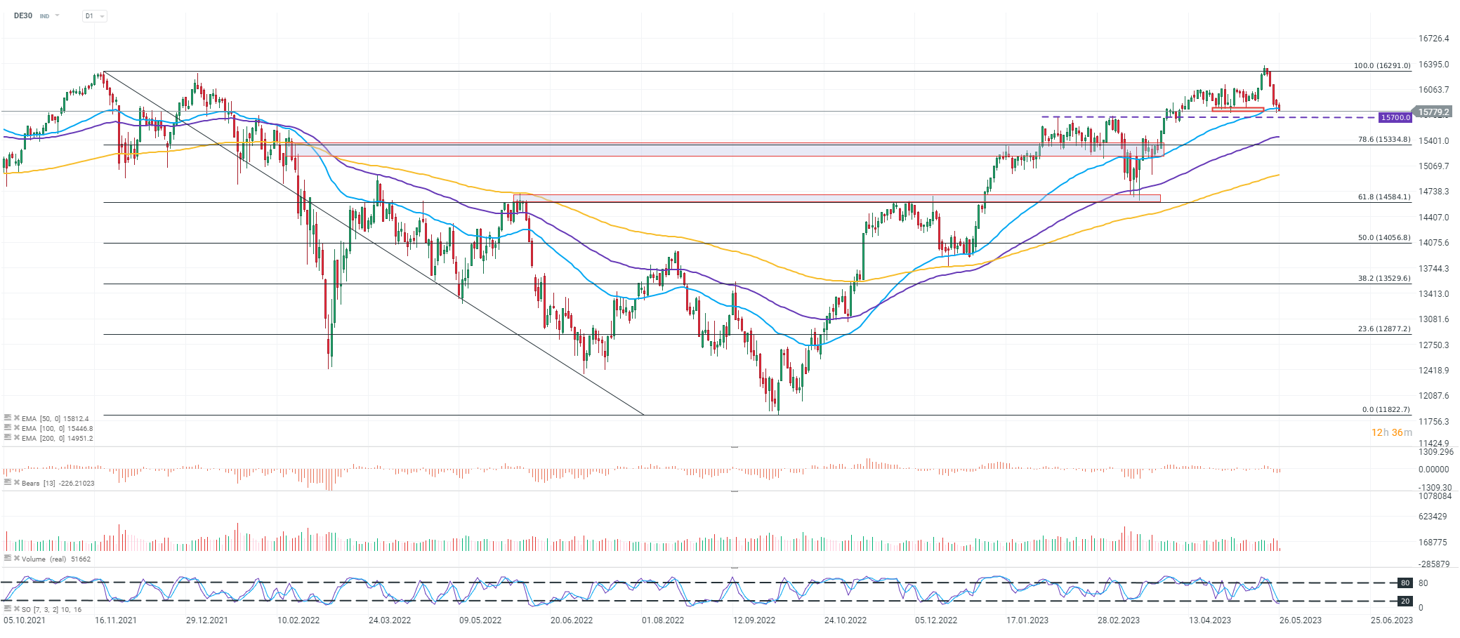 Kontrakty terminowe oparte o niemiecki indeks DAX (DE30) przedłużają falę spadkową i próbują wybić się poniżej 50- dniową, wykładniczą, średnią kroczącą (niebieska krzywa). Źródło: xStation 5