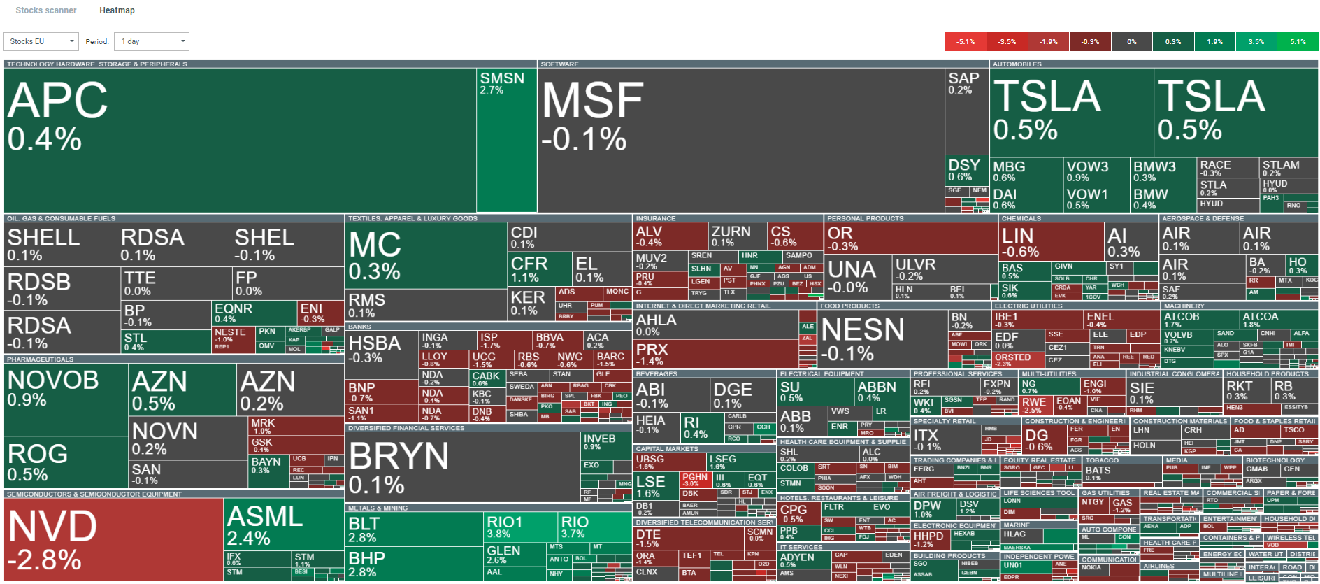 Nastroje w Europie podczas piątkowej sesji giełdowej są relatywnie mieszane. Sentymenty wspierają przede wszystkim spółki z branży półprzewodników oraz AI, które zyskują na fali publikacji wyników spółki Nvidia, niemniej same ADR’y oparte o spółkę Nvidia tracą w chwili obecnej blisko 3%. Źródło: xStation 5