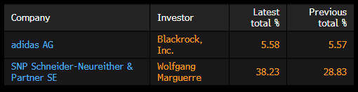 Zmiany udziałów instytucji w poszczególnych spółkach indeksu DAX (dane z ostatniej sesji). Źródło: Bloomberg