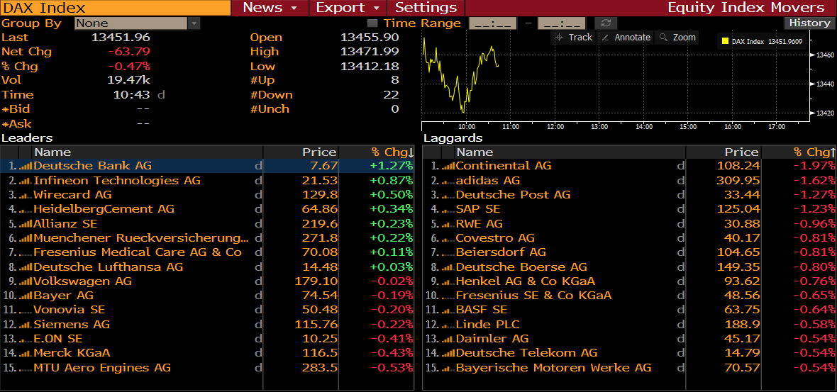 Hochtief (HOT.DE) jest najgorzej radzącą sobie spółką w indeksie MDAX, tracąc 8%. Spadek wartości jest powiązany z ogłoszeniem ze strony spółki córki Cimic Group. Cimic zamierza odejść z rynku Bliskiego Wschodu oraz zawiesić wypłatę dywidendy. Decyzja nastąpiła po tym, jak dokonano odpisów na poziomie 1,8 mld AUD ze względu na nieudane inwestycje.