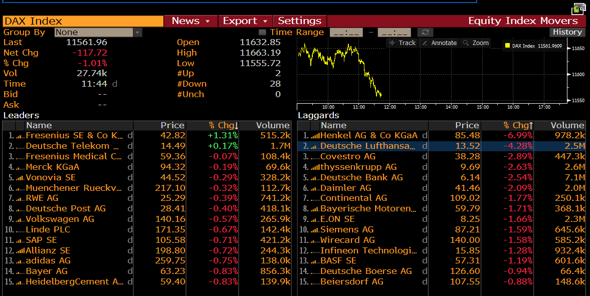 Wśród spółek, które tracą podczas dziejszej sesji najwięcej znajduję się m.in Henkel. Jest to reakcja na obiżoną, roczną prognozę wyników firmy. Źródło: Bloomberg