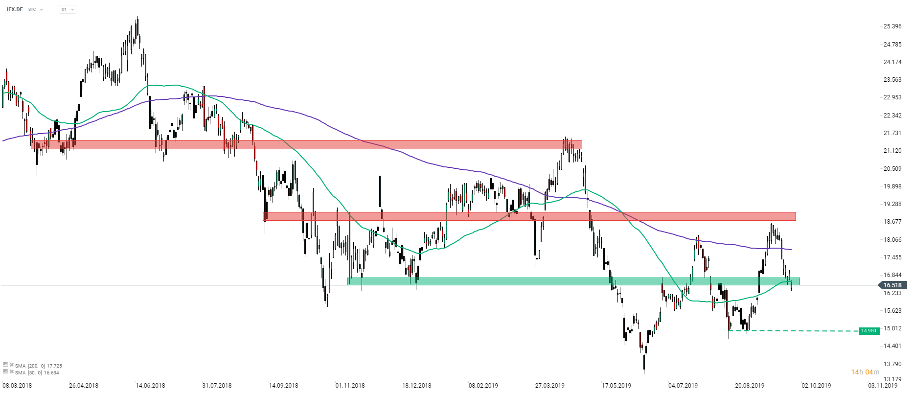 Cena akcji Infineon (IFX.DE) przebiła się powyżej 200 sesyjnej średniej ruchomej (fioletowa linia). Jednakże, ruch w górę odwrócił się nieco poniżej strefy oporu, wahając się w pobliżu 19 euro. Następnie cena szybko cofnęła się poniżej wspomnianej średniej kroczącej i dalej podążała w kierunku strefy wsparcia na poziomie 16,50 euro. Zostało ono jednak przełamane, co otworzyło drogę dla niedźwiedzi, do próby testowania lokalnych minimów na pułapie 14,95 euro. Źródło: xStation5.