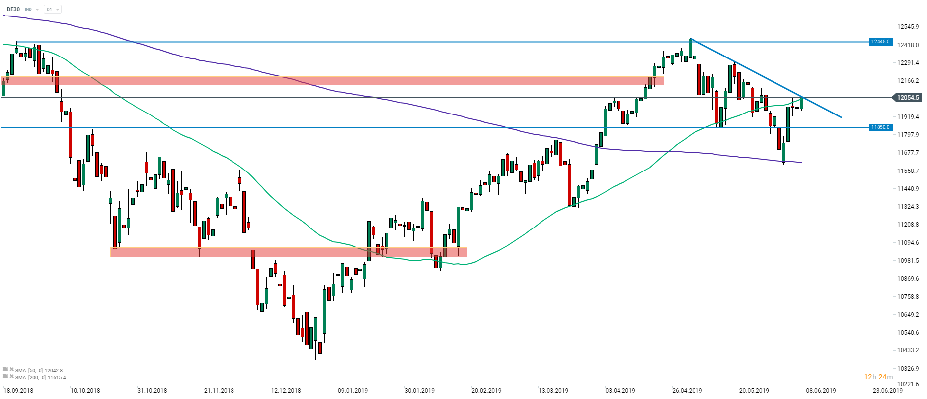 Niemiecki DAX (DE30) kontynuuje odbicie z okolic 200-sesyjnej średniej kroczącej. Impet wzrostowy zaczął wyhamowywać po dotarciu do 50-sesyjnej średniej kroczącej (zielona linia na wykresie). W tym samym miejscu znajduje się również linia trendu spadkowego. Kombinacja tych dwóch technicznych poziomów oporu może przysporzyć kupującym nieco kłopotów. W przypadku cofnięcia najbliższym poziomem wsparcia pozostaje poziom 11850 pkt. Źródło: xStation5