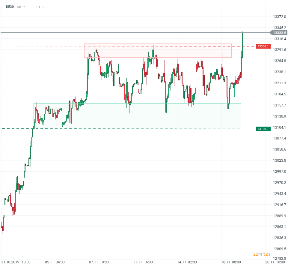 W ostatnich dniach widzieliśmy konsekwentne wzrosty na amerykańskich indeksach, ale niemiecki DE30 utknął w konsolidacji pomiędzy 13100 a 13300 pkt. Górne ograniczenie zostało dziś jednak przełamane i tym samym DE30 znalazł się najwyżej w tym roku – od początku roku wzrosty wynoszą już 27%! Byki będą teraz spoglądać na okolice 13600, gdzie znajduje się historyczne maksimum ze stycznia 2018 roku.