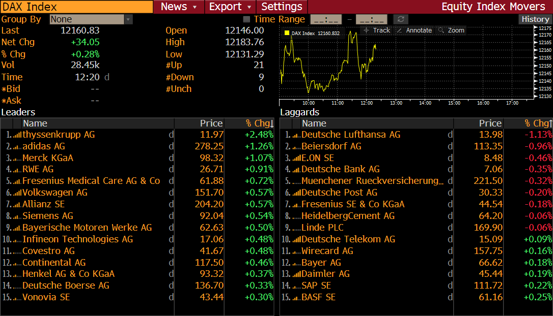 Pomimo faktu, że azjatyccy inwestorzy podczas ostatniej sesji w tym tygodniu odznaczyli się zdecydowaną skłonnością do ryzyka, w Europie optymizm jest znacznie mniej żywiołowy. Główne indeksy rozpoczęły ten dzień kolorem czerwonym. Wydaje się, że optymizm, który pojawił się po wiadomości o rozmowie telefonicznej między amerykańskimi i chińskimi urzędnikami , powoli zanika. Mając na uwadze fakt, że już w następny czwartek odbędzie się posiedzenie EBC, można oczekiwać, że tego dnia zmienność na rynkach będzie nad wyraz duża. “Pikanterii” dodaje fakt, że inwestorzy są raczej podzieleni co do osądów dotyczących przyszłej polityki monetarnej w Europie. Choć konsensus rynkowy wskazuje na obniżkę stóp procentowych i równoczesne wznowienie programu QE, wielu przeciwników (głównie z Francji, Niemiec i Austrii) wskazuje na fakt, że taki scenariusz może nie mieć miejsca. Skupiając się jednak na samym indeksie, DE30 zdołał przebić się powyżej swojego ważnego oporu, którym była 100 dniowa średnia krocząca.