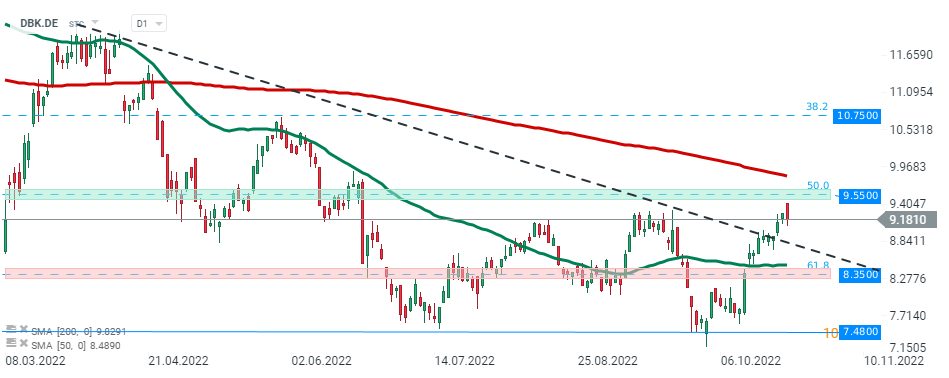 Akcje Deutsche Bank (DBK.DE) rozpoczęły rajd ulgowy w ostatnich dniach, jednak kupującym nie udało się przebić powyżej głównego oporu na poziomie 9,55 euro, który zbiega się z 50,0% zniesienia Fibonacciego fali wzrostowej rozpoczętej na początku pandemii. Jeśli sprzedającym uda się utrzymać kontrolę, ruch spadkowy w kierunku wsparcia przy 8,35 EUR może się pogłębić. Źródło: xStation5
