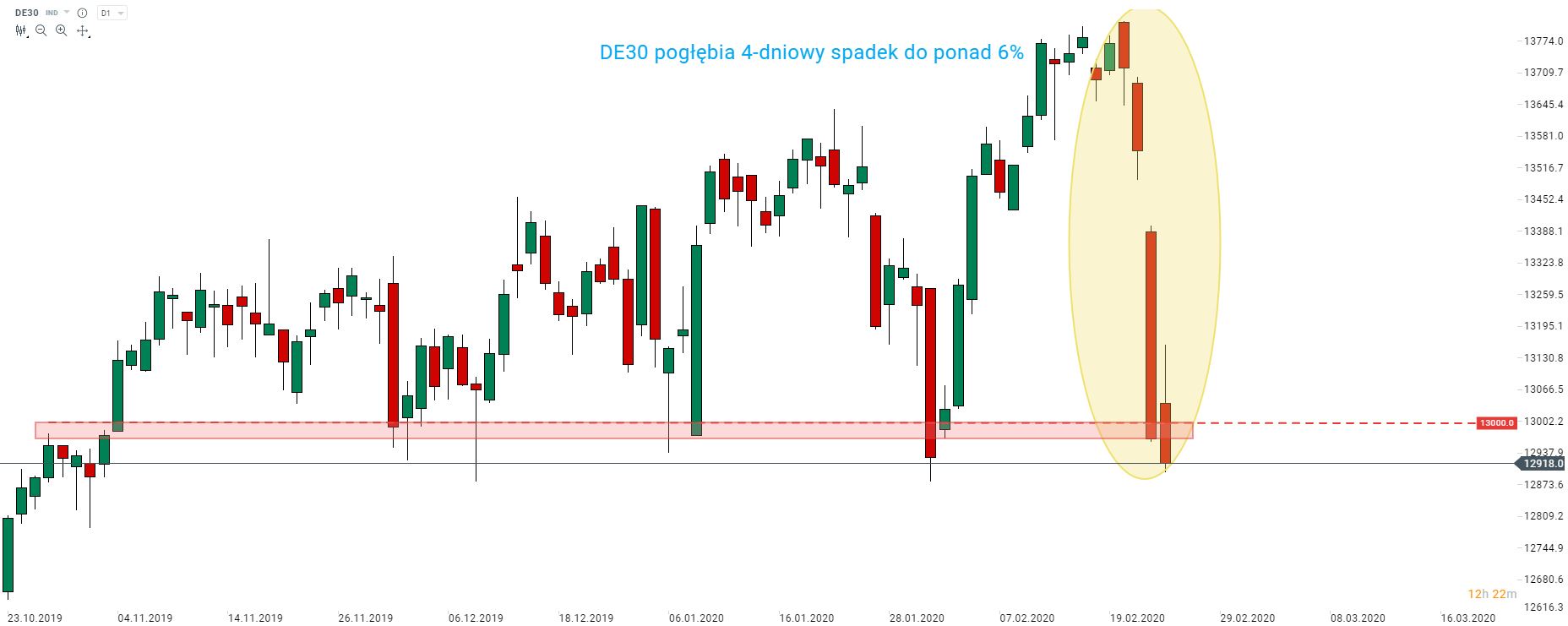 Pomimo wyższego otwarcia dzisiejszej sesji, europejskie indeksy giełdowe kontynuują przecenę napędzaną obawami o wpływ koronawirusa na gospodarkę. Niemiecki DE30 przebił się poniżej kluczowej strefy wsparcia przy poziomie 13000 pkt i zdołał nawet przetestować poziom 12900 pkt. Indeks notowany jest na najniższym poziomie od końcówki stycznia.