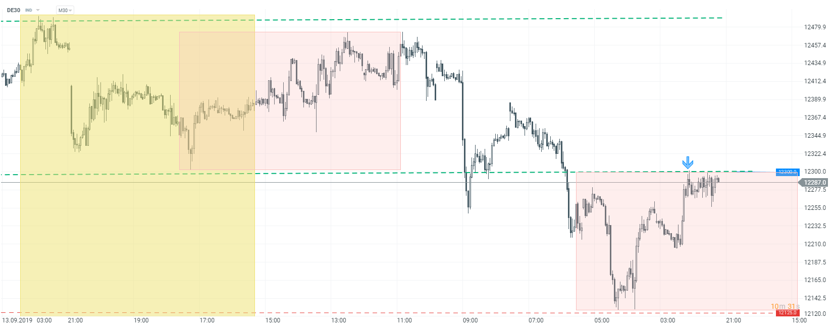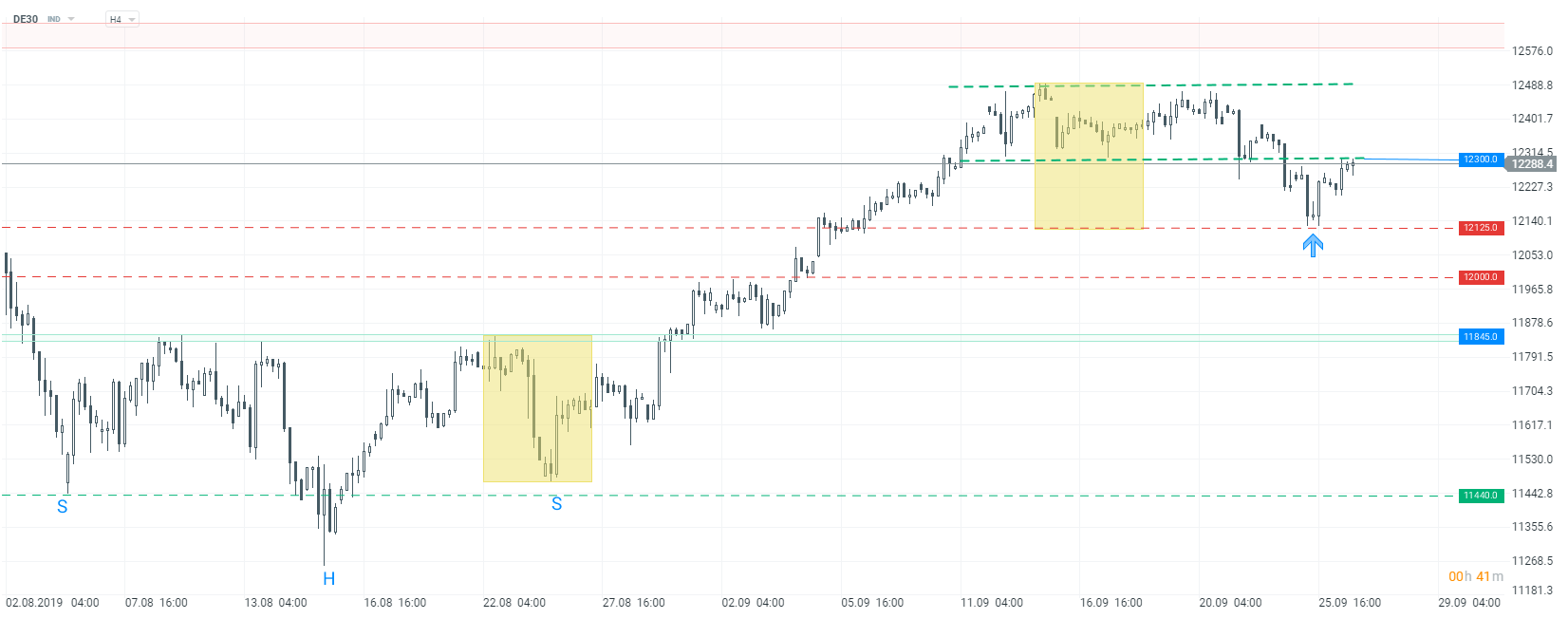 O tym, że niemiecki indeks giełdowy odbił od dolnego ograniczenia układu Overbalance wspominaliśmy już wczoraj, a także dziś rano. Niemniej warto także zwrócić uwagę na to co dzieje się na niższym przedziale czasowym (o tym w drugim akapicie). Zmienność podczas dzisiejszej sesji jest dość niska jak na specyfikę DE30. Niemniej po obronie kluczowego wsparcia przy 12 125 pkt kurs ruszył wyraźnie w górę. Oczywiście z perspektywy interwału H4 potwierdza to tendencję wzrostową, niemniej indeksy w USA nie kontynuują dziś dalszej zwyżki, wręcz przeciwnie, znajdują się pod kreską, co może także przeszkodzić w wzrostach na DE30. Kurs kilka razy odbijał się dziś od poziomu 12 300 pkt, dlatego też stanowi on kluczowy opór. Dopiero jego pokonanie otworzy drogę do tegorocznych maksimów.