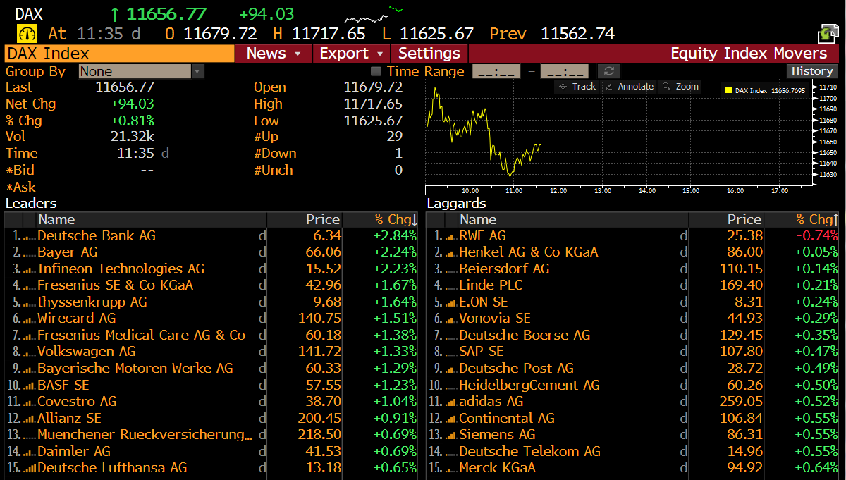 Niemieckie akcje podczas poniedziałkowej sesji zyskują dzięki uwagom ministra finansów na temat możliwej stymulacji gospodarki w razie wystąpienia recesji. Kredytodawcy, w tym Deutsche Bank (DBK.DE) i Commerzbank (CBK.DE), a także spółki przemysłowe takie jak Thyssenkrupp (TKA.DE) należą do najmocniej zyskujących spółek w trakcie dzisiejszej sesji. Optymistyczne nastroje są na tyle silne, że prawie każdy członek indeksu DAX rośnie na pierwszej połowie sesji, nawet pomimo szeregu mało optymistycznych rekomendacji analityków.
