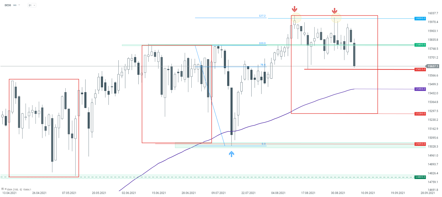 Patrząc technicznie na interwał D1, na wykresie może budować się formacja podwójnego szczytu. Linia szyi dla tego układu znajduje się przy 15 615 pkt, a jej ewentualne pokonanie może przełożyć się na przyspieszenie przeceny. W przypadku realizacji takiego scenariusza, kolejnym wartym uwagi miejscem będzie średnia z ostatnich 100 okresów - 15 466 pkt i dolne ograniczenie układu 1:1 przy 15 280 pkt.