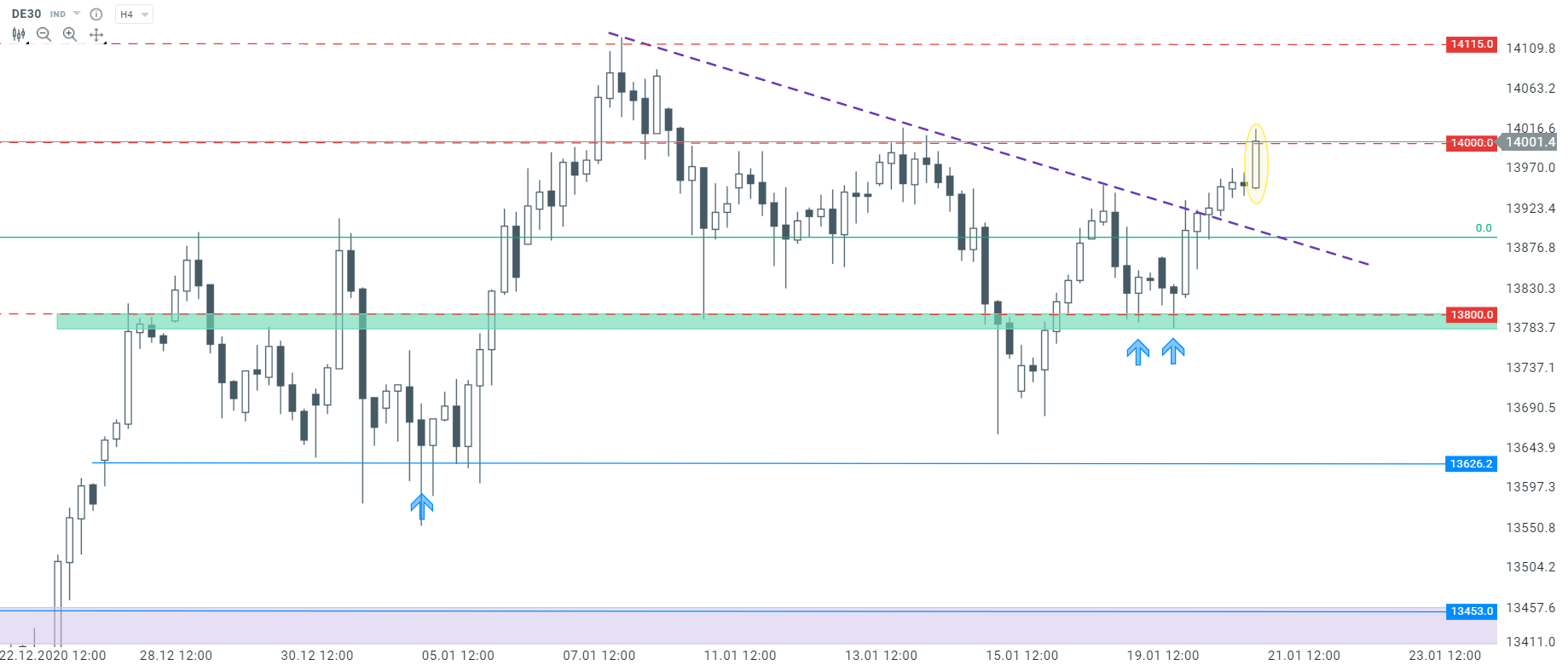 Początek sesji europejskiej przynosi dalsze wzrosty na głównych indeksach giełdowych. Inwestorom na Starym Kontynencie udzielają się więc dobre nastroje panujące podczas wczorajszej sesji amerykańskiej, a także azjatyckiej. DE30 rozpoczyna dzisiejszy dzień od wzrostów, i tuż po godzinie 9:00 znajduje się powyżej poziomu 14 tysięcy punktów. Patrząc na sytuację techniczną, ruch w górę jest konsekwencją pokonania lokalnej linii poprowadzonej po ostatnich wierzchołkach. Jeżeli obecny sentyment nie ulegnie zmianie, możliwy jest atak na historyczne maksima przy 14 115 pkt.