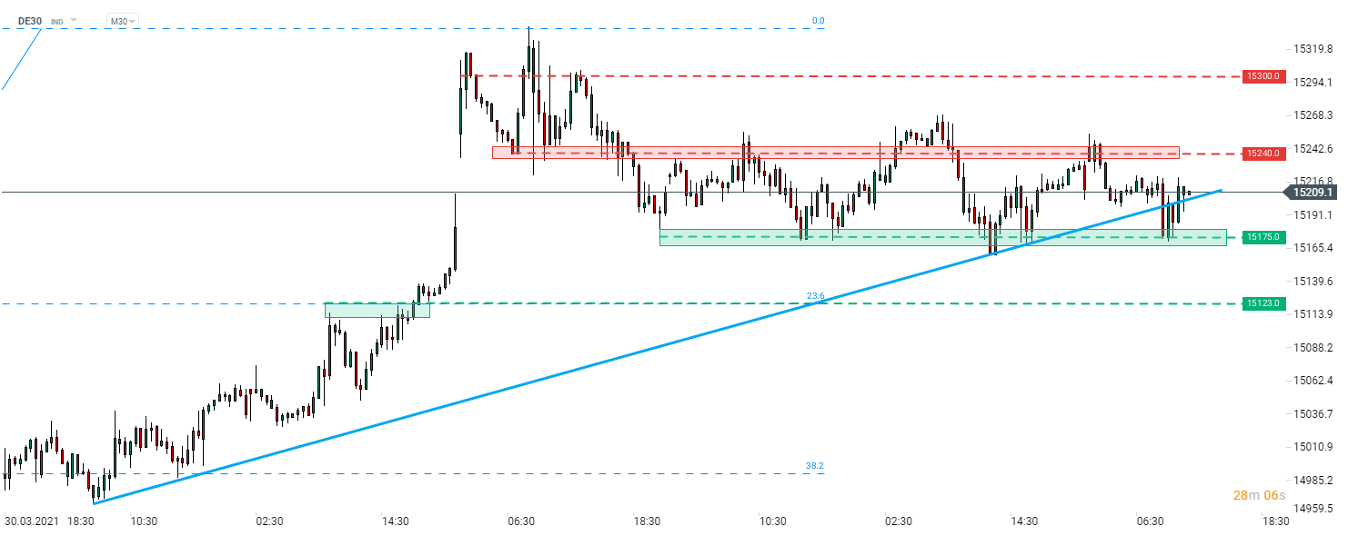 Można odnieść wrażenie, że DE30 utknął w wąskim przedziale wahań 15 175 - 15 240 pkt. Indeks nie zdołał w tym tygodniu dokonać istotnego wybicia (ani w górę ani w dół). Dopiero opuszczenie tego przedziału wahań umożliwiłoby większy ruch. W zależności od kierunku, traderzy powinni się skupić na: 15 300 pkt (okolice ATH, opór) bądź 15 123 pkt (zniesienie 23,6%, wsparcie). Na dziś nie zaplanowano kluczowych odczytów ekonomicznych, więc handel na DE30 może pozostać względnie spokojny. Źródło: xStation5