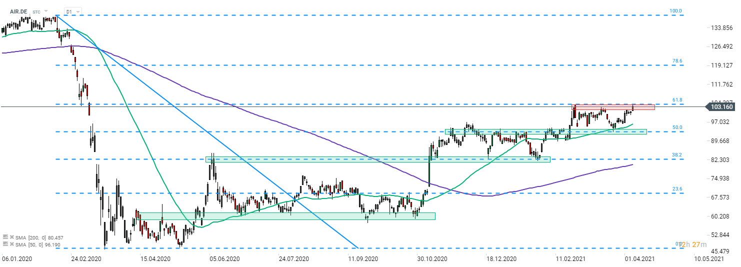 Airbus (AIR.DE) wspiął się dziś na nowe post-pandemiczne szczyty intraday. Kurs zmaga się jednak ze strefą oporu przy zniesieniu 61,8% pandemicznych spadków. Cena wydaje się respektować zniesienia Fibonacciego, stąd w przypadku wybicia w górę byki mogłyby obrać za cel zniesienie 78,6% przy €119,50. Źródło: xStation5