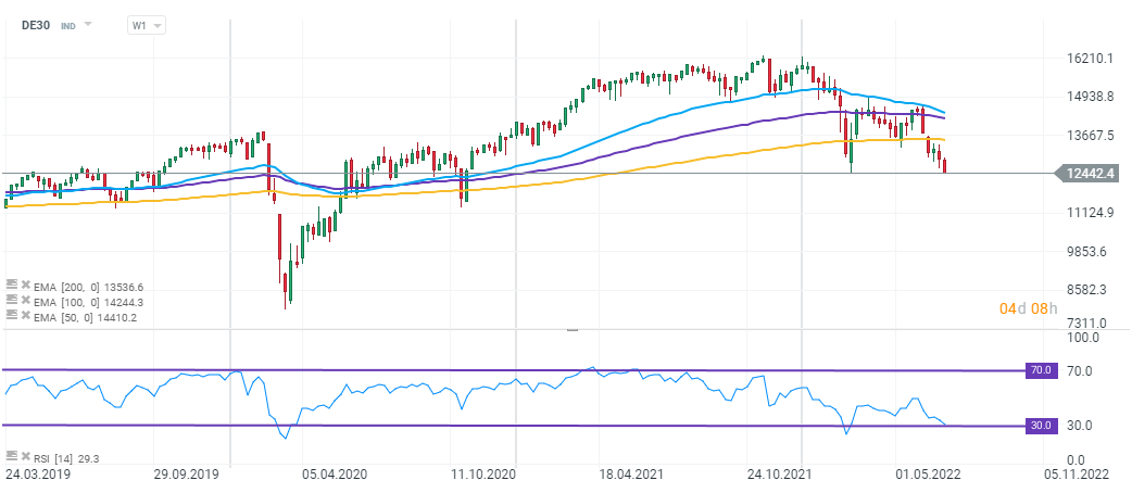Druga część dzisiejszej sesji giełdowej przynosi przyspieszenie wyprzedaży głównych parkietów na Starym Kontynencie, gdzie DE30 chwilowo przebił tegoroczne minima i notowany jest na poziomach niewidzianych od listopada 2020 roku. Rynek ucieka do bezpiecznych przystani, zyskuje m.in. dolar amerykański oraz jen japoński. Polski W20 jest drugim najgorzej radzącym sobie indeksem na kontynencie (spadając o ponad 3%), podczas gdy UK100 oraz FRA40 tracą odpowiednio 2,24% oraz 2,21%.