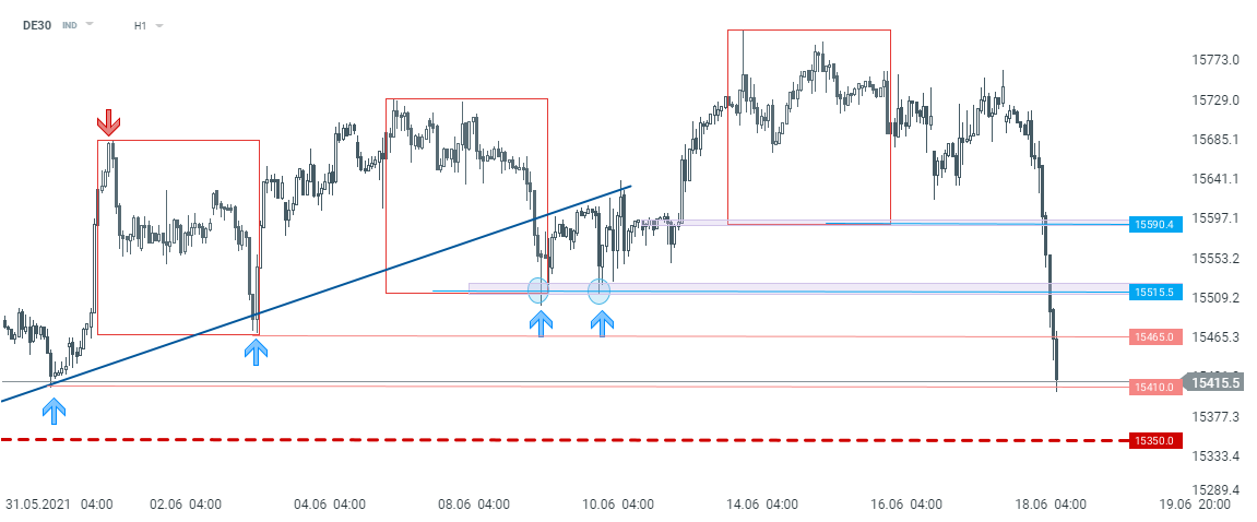 DE30 spadł dziś poniżej kilku ważnych poziomów cenowych. Indeks zatrzymał się przy 15 410 pkt, czyli dotarł do stanu z 31 maja, redukując całość czerwcowych wzrostów. W przypadku kontynuacji wyprzedaży, warto będzie zwrócić uwagę na 15 350 pkt - kolejne minimum z drugiej połowy maja.