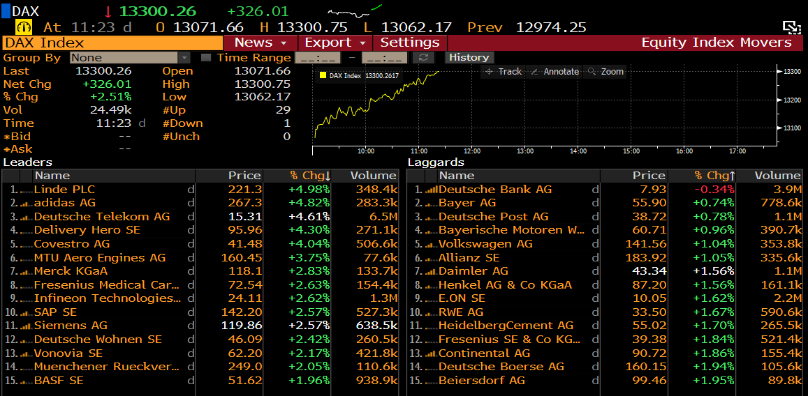 Rynek akcyjny w Europie w środkową sesję tygodnia zachowuje się bardzo pozytywnie. Niemiecki DAX testuje okolice 13300 punktów, czyli „post-pandemiczne” szczyty. Nastroje znacząco poprawiły się wczoraj po publikacji indeksu ISM dla przemysłu w USA. Główne indeksy w Europie zyskują dzisiaj nawet powyżej 2%.