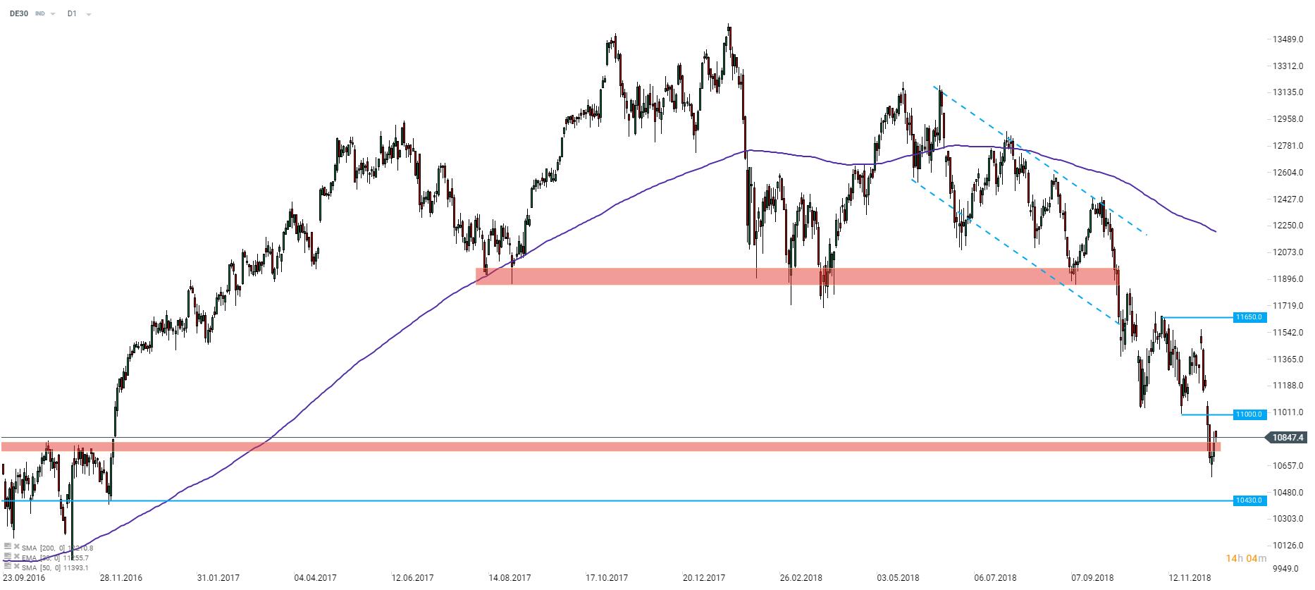 Wyprzedaż na DAXie zakończyła się w okolicach 10600 punktów. Indeks powrócił powyżej ważnej strefy popytowej i następnie przetestował okolice 10900 punktów, skąd widać było jednak cofnięcie. Nieco wyżej przy 11050 punktach znajduje się dolne ograniczenie luki podażowej. Źródło: xStation5