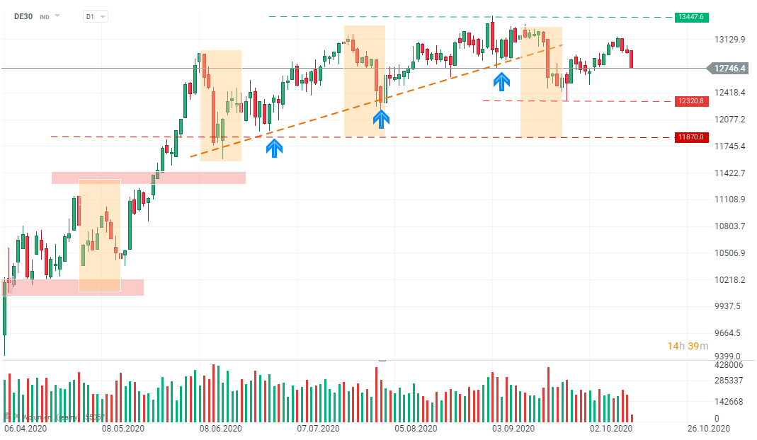Po rynkowym optymizmie z początku tygodnia nie ma już śladu. Kolejne rekordy przypadków COVID dają się we znaki rynkom, szczególnie w Europie. Częściowe lockdowny w Czechach i Holandii to może być dopiero początek – możliwość wprowadzenia ograniczeń zapowiedziała też kanclerz Angela Merkel. To z pewnością nie jest scenariusz, na który inwestorzy liczyli podczas wakacyjnej hossy. DE30 jest najniżej od 2 października ze słabym wsparciem na poziomie 12320 pkt. i mocniejszym 11870 pkt.